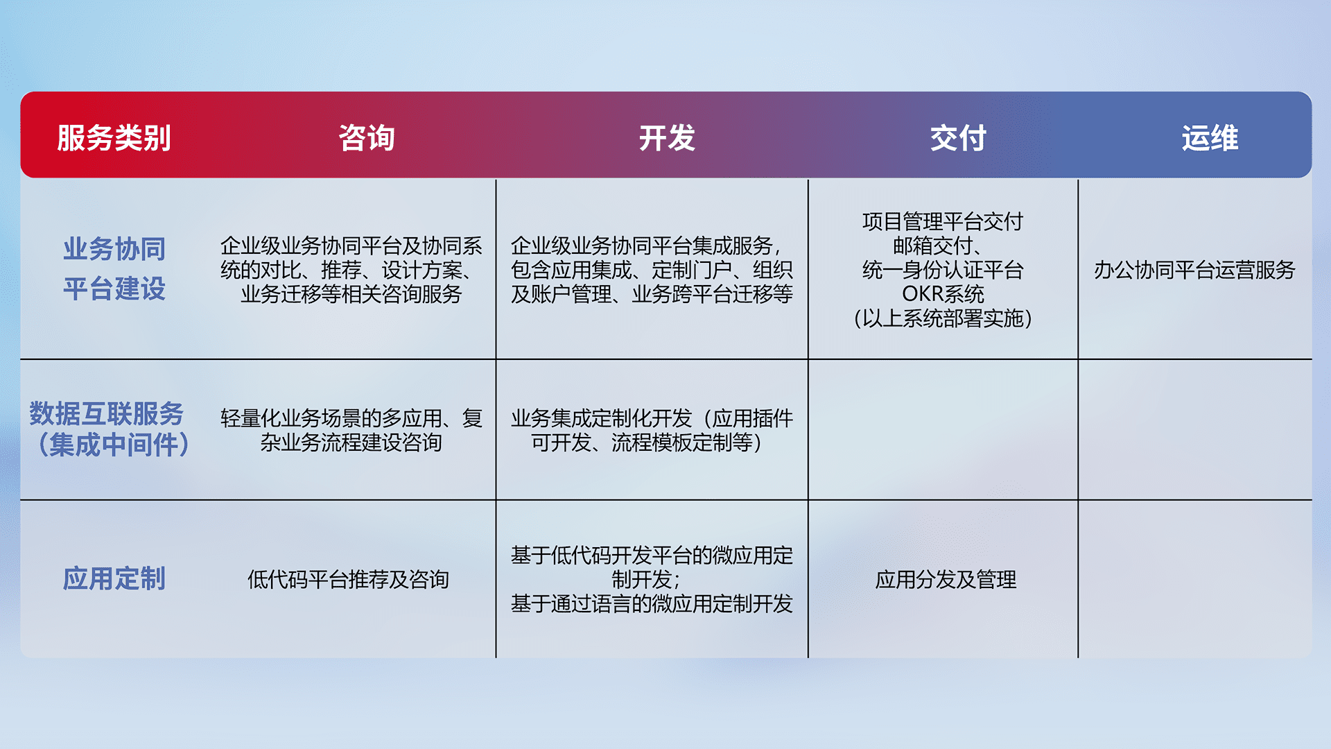 针对钉钉、、、企微、、、、IDaas等平台级产品提供产品的规划、、、、方案、、、交付、、、定制化开发等服务,,,,实现如统一协同办公、、智能客户服务、、混合会议管理、、智能数据查询、、等业务场景,,实现数字化转型。。