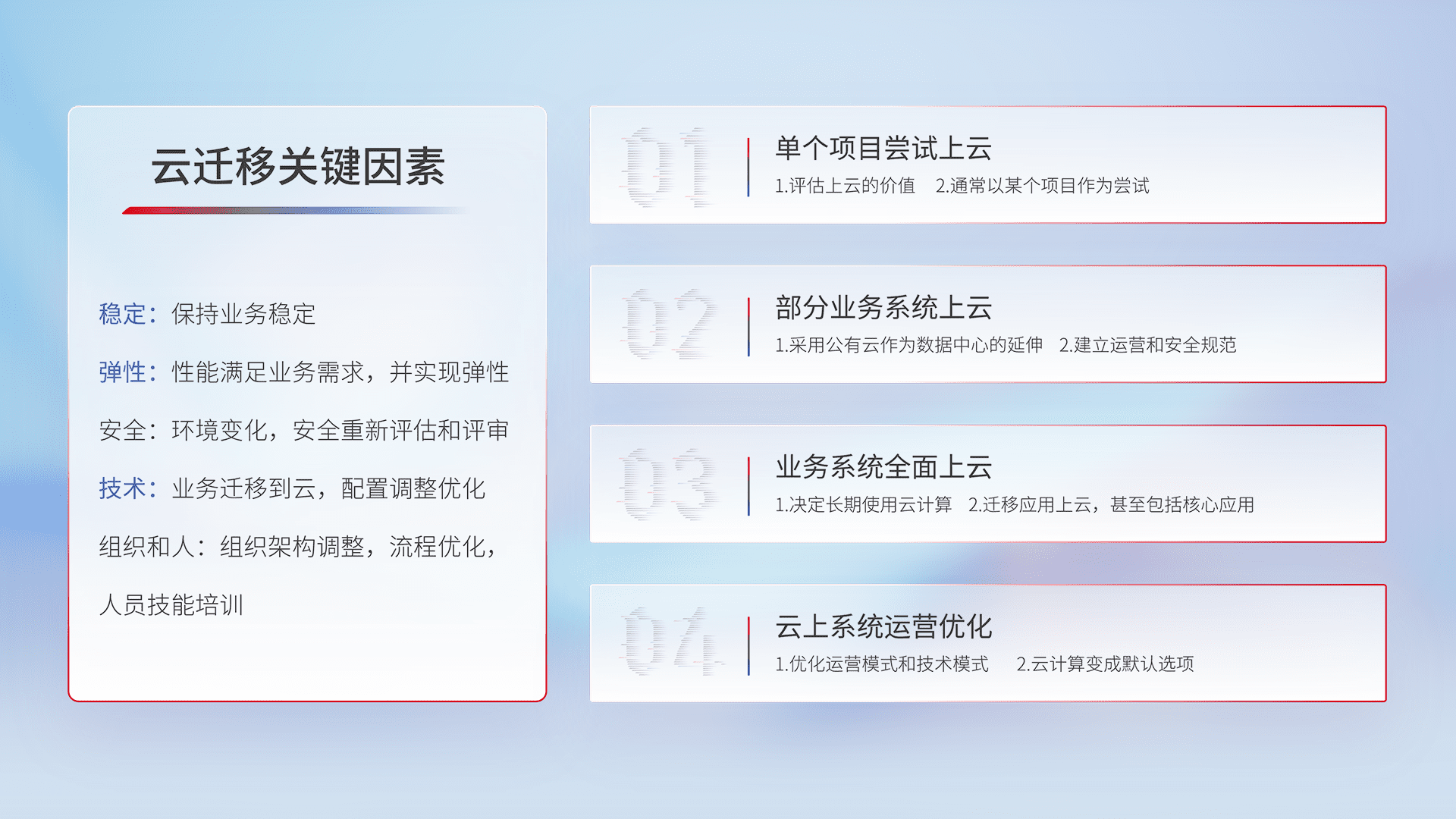 结合实际业务,,从规划设计、、云平台选型、、、云原生改造、、、数据迁移、、集成交付,,,,迁移全过程为客户识别最佳上云路径,,,做好风险识别管理,,设计网络架构、、、身份权限、、、、安全审计合规、、操作审计、、、日志审计、、、监控告警策略、、多站点容灾设计等,,,,对云上基础设施进行整体规划,,,提升IT治理水平,,以满足弹性、、、高可用、、、、高性能的需求。。。。